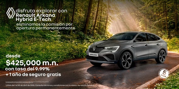 Atrévete a explorar con estilo y eficiencia en el Renault Arkana Hybrid E-Tech, el SUV coupé que combina diseño elegante, tecnología híbrida y gran rendimiento. Como beneficio permanente, eliminamos la comisión por apertura en tu financiamiento. Adquiérelo con un precio desde $425,000 MXN, una tasa preferente del 9.99% y 1 año de seguro gratis incluido. Además, disfruta de 5 años de garantía para mayor tranquilidad. Innovación, confort y ahorro en cada viaje. Oferta válida del 1 al 30 de abril de 2026.