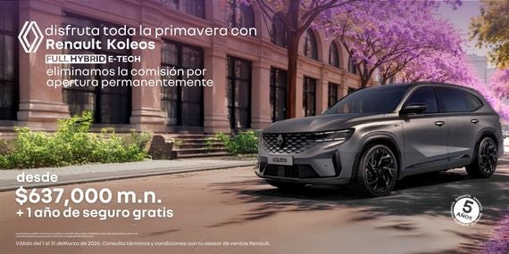 Celebra la primavera al volante de la Renault Koleos Full Hybrid E-Tech, la SUV de lujo que combina tecnología híbrida avanzada, confort premium y diseño sofisticado. Como beneficio permanente, eliminamos la comisión por apertura en tu financiamiento. Adquiérela con un precio desde $637,000 MXN, 1 año de seguro gratis incluido y 5 años de garantía para mayor tranquilidad. Elegancia, eficiencia y espacio familiar en cada viaje. Los precios pueden variar por modelo o versión.