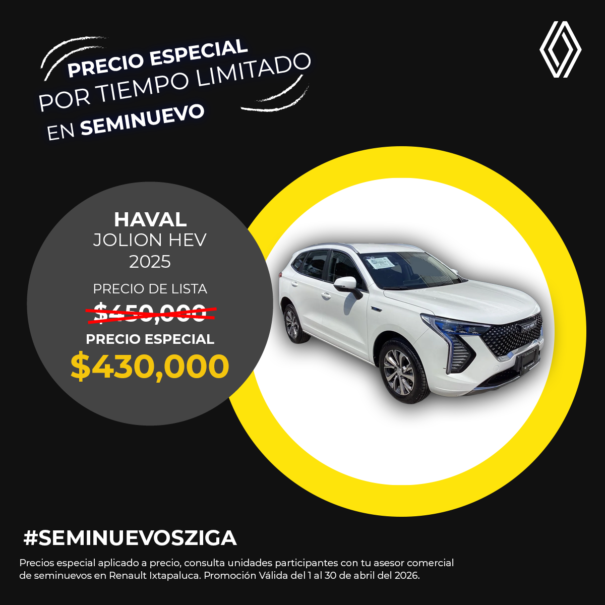 El precio mostrado ya incluye el bono aplicado. Válido únicamente para Haval Jolion HEV modelo 2025 seminuevo.