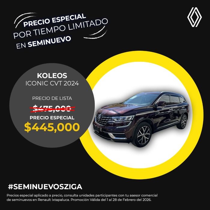 El precio mostrado ya incluye el bono aplicado. Válido únicamente para Renault Koleos Iconic CVT modelo 2024 seminuevo