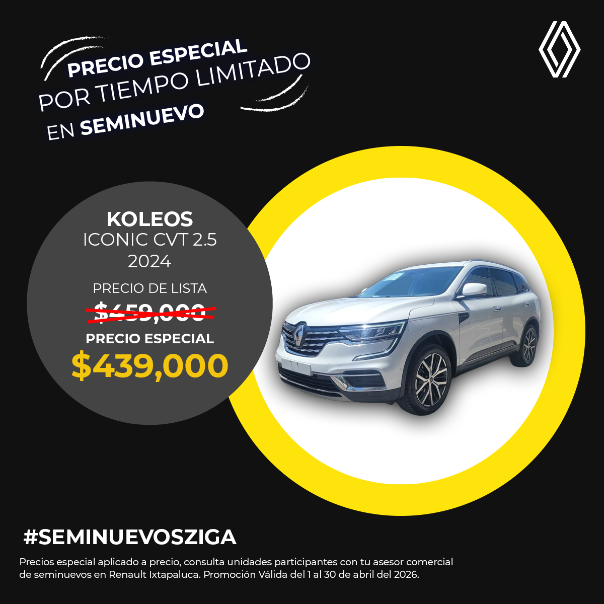 El precio mostrado ya incluye el bono aplicado. Válido únicamente para Renault Koleos Iconic CVT 2.5 modelo 2024 seminuevo.